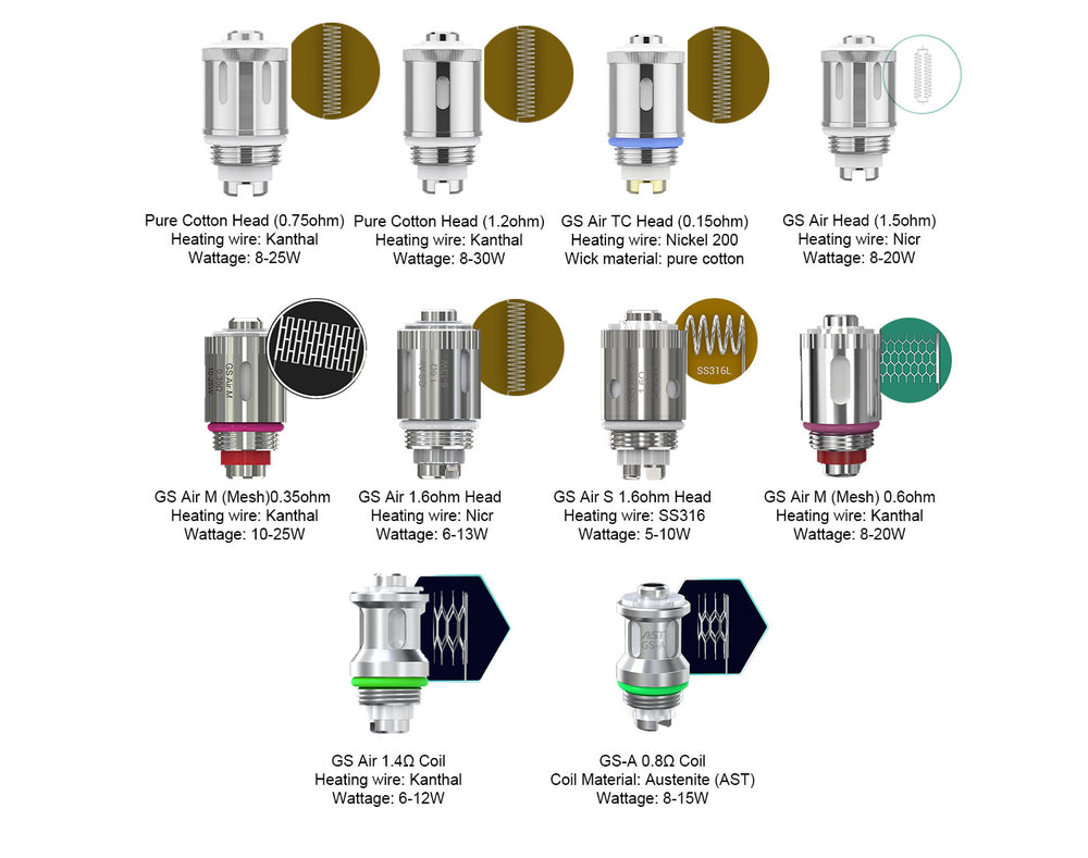 GS Air Coil is compatible with some Eleaf GS Air Atomizers and Mini iStick 2 Kit . It comes with different coil resistance for you to choose, and you will enjoy perfect flavor with the different coils. 5pcs each pack.