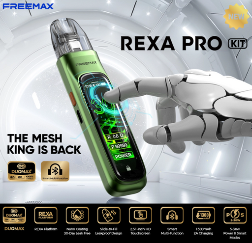 Freemax Rexa Pro Pod System Kit is the new line of the Freemax Rexa series, featuring a 1300mAh built-in battery capable of super-fast recharging, a super large 3ml juice capacity and 30W max output.It is equipped with a full screen that shows important data, including output power and puff count & resistance. It offers seven safety protections so that you can enjoy vaping freely. With a super long lifespan and superior taste of Freemax Rexa Pro , your vaping experience will be extraordinary and superb.