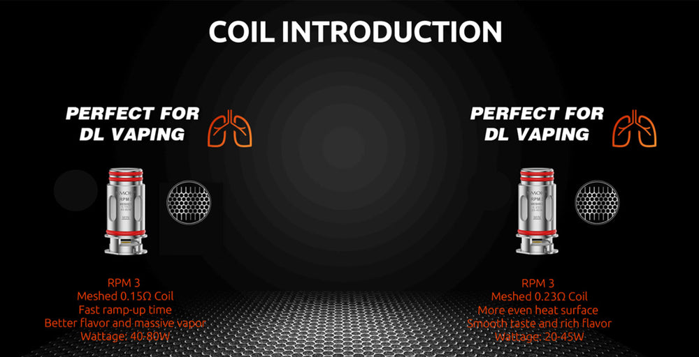 Smok RPM 3 Replacement Coil features a 0.15ohm and 0.23ohm mesh coil and is installed in a press-fit manner, which is designed for Smok RPM 5 & RPM 5 Pro Kit to have an MTL vape, 5pcs a pack.