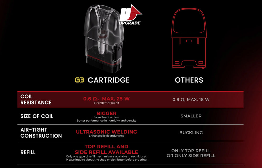 Here comes the CALIBURN G3,It is the first CALIBURN among the G series that supports 0.6ohm , max 25 W output made for RDL Freebase users and loose MTL Nic Salt users. The integrat - ed coil cartridge brings the features of leakage-proof and mess-free to the next level. You can experience a greater vaping with a flavor boost , constant stability and a throat hit