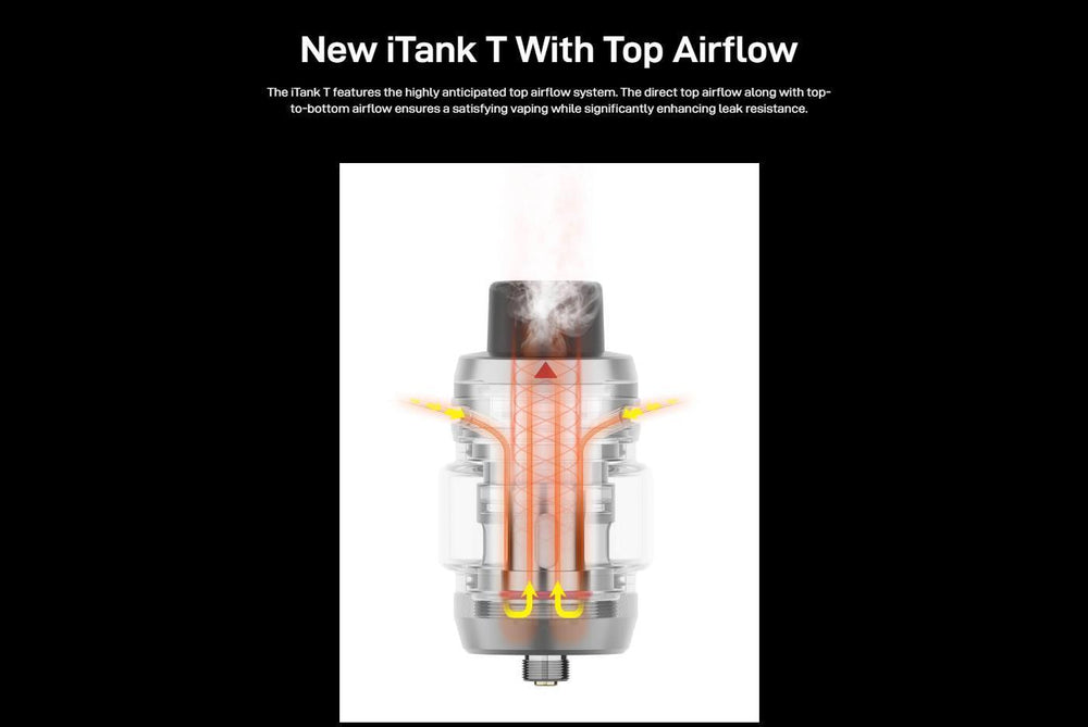 The iTank T features the highly anticipated top airflow system. The direct top airflow along with top-to-bottom airflow ensures a satisfying vaping while significantly enhancing leak resistance.
