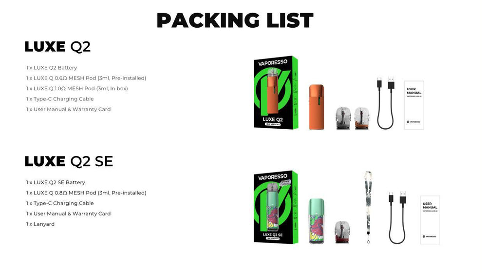 The Vaporesso LUXE Q2 features deluxe leather and adjustable airflow for premium vaping experience, Built-in 1000mAh Battery, hold 3ml ejuice capacity with the side filling syetem, 2A fast charging,full charged in 30mins and can use in nest 48hs vaping,fast charging reduces the waiting time for charging and greatly elevates the user experience.Fully compatible with all LUXE Q pods (2ml cartridge is top filling system), they cater to nic salt and freebase.